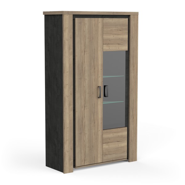 – 1 porte pleine avec 3 étagères bois et 1 porte vitrée avec 3 étagères en verre.